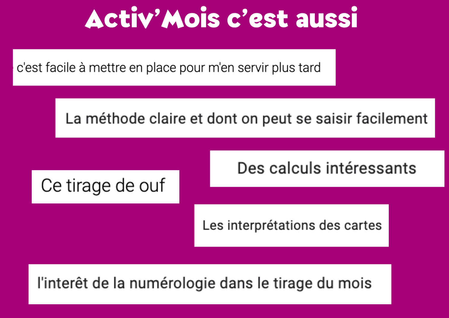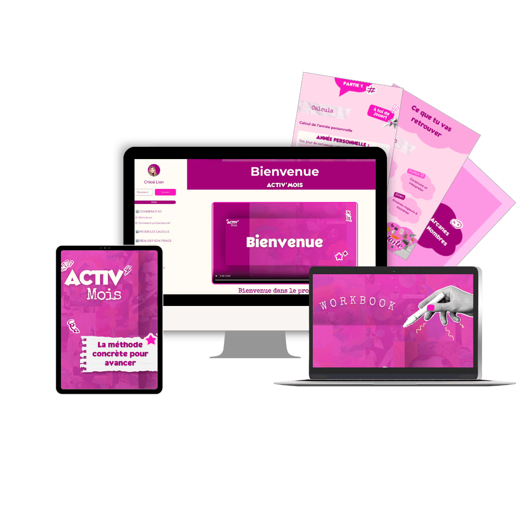 La formation Activ’Mois est 100 % autonome. Elle a été pensée pour t’apprendre à poser ton tirage mensuel de façon claire, fluide et structurée, en alliant fond et forme.