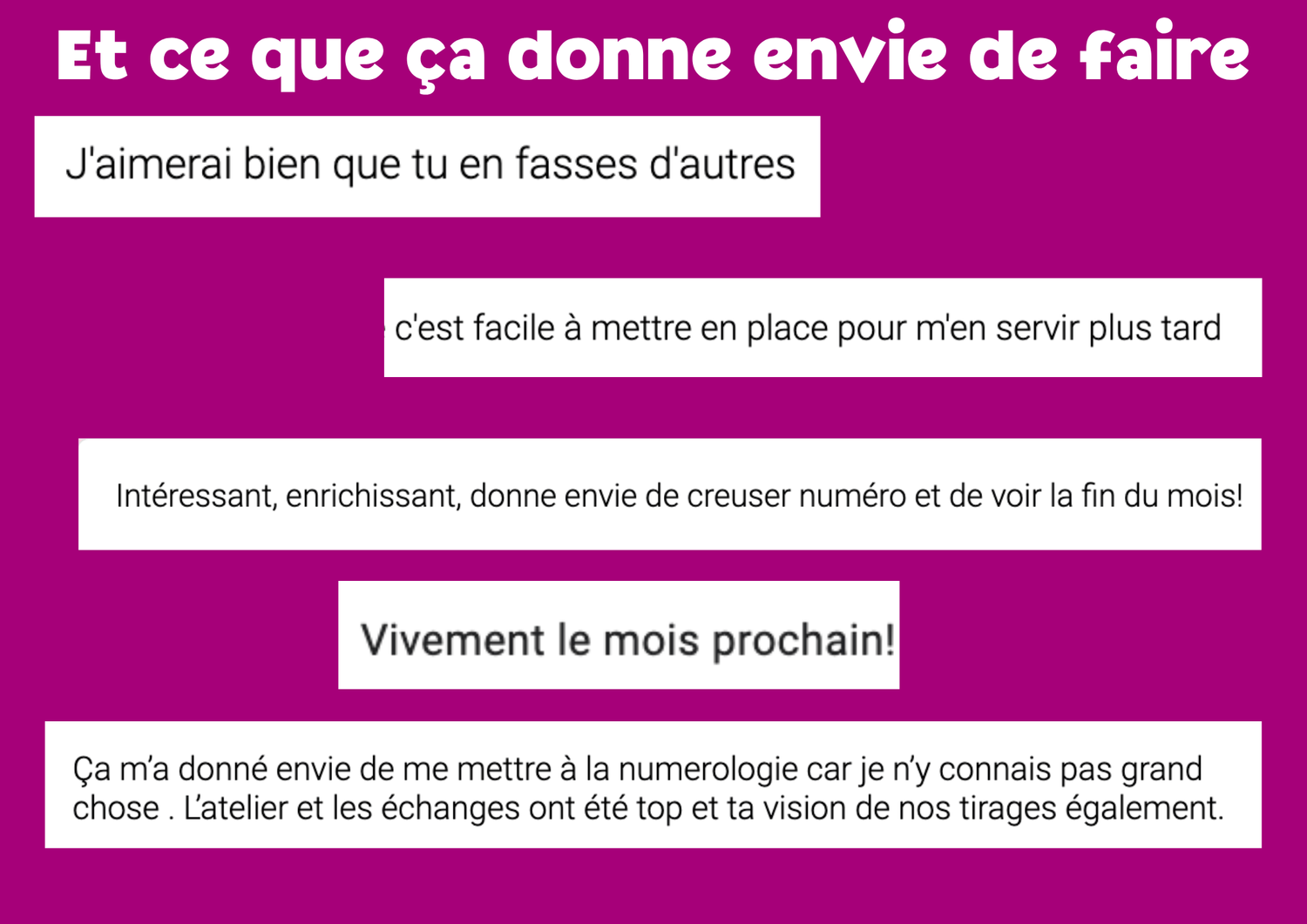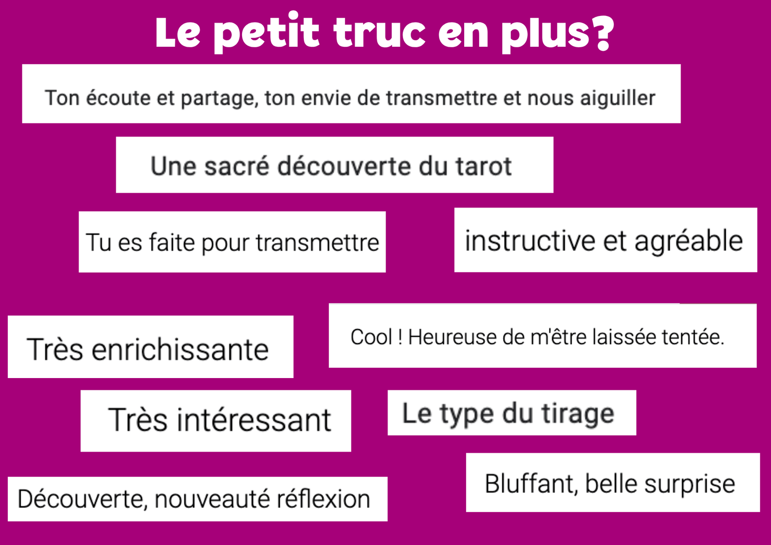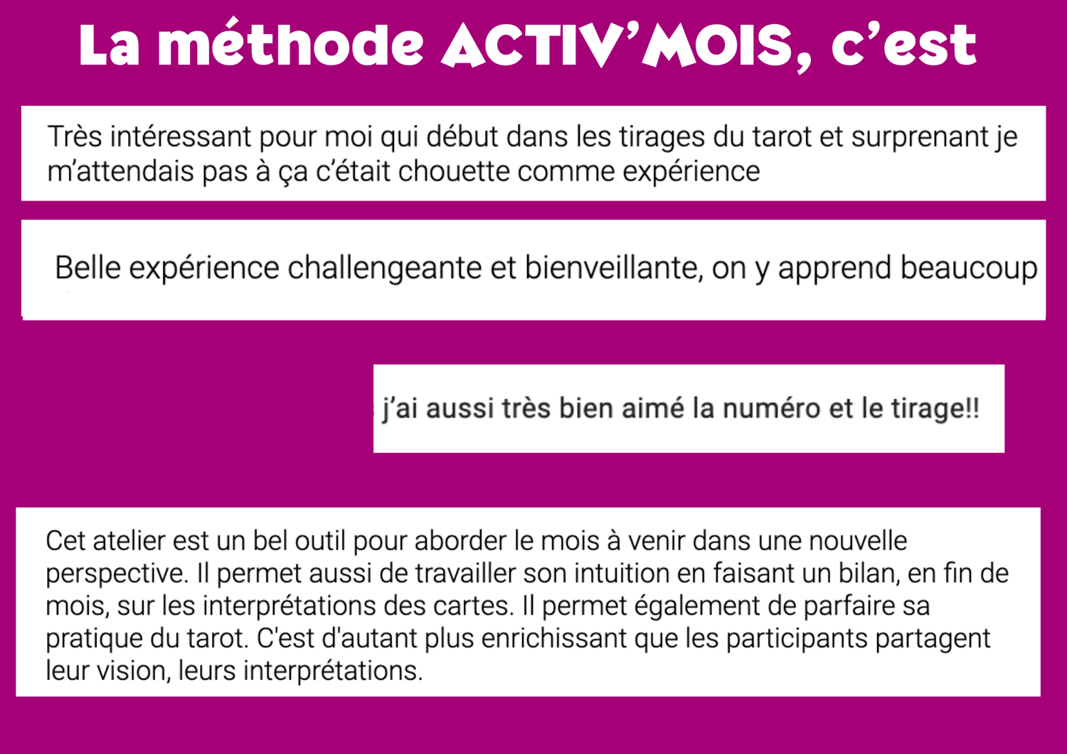 Un lieu pour se retrouver entre passionné.e.s, pratiquer ensemble, partager ce qui se passe dans ta vie, tes prises de conscience, tes intuitions, et faire des liens entre les tirages et le réel.